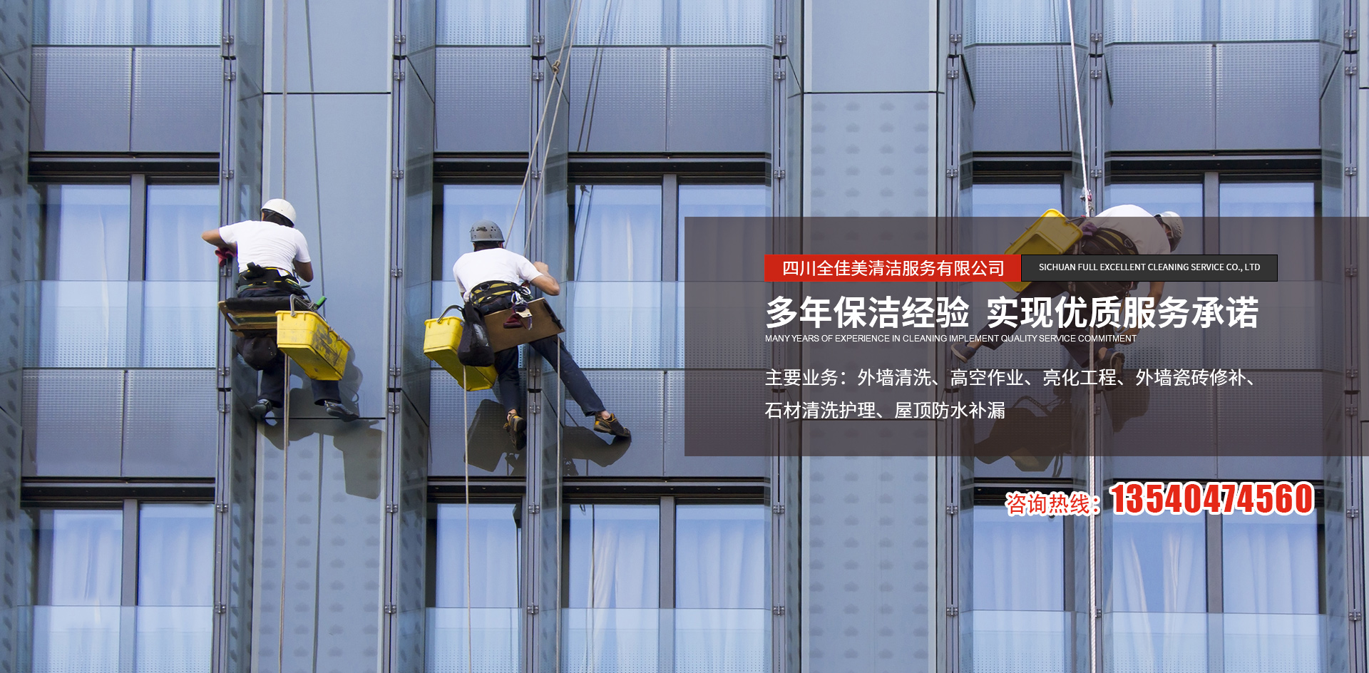 四川全佳美清潔服務有限公司成立于2017年11月20日,注冊資本200萬元人民幣,是一家專業(yè)從事高空外墻清洗,外墻維修,開荒保潔,石材養(yǎng)護,外墻防水等一體化的工程服務公司。公司先后服務于成都鐵路培訓學校,雙流空港酒店,省體育館等寫字樓及工業(yè)園區(qū)的外墻清洗保潔及維修服務。經(jīng)過多年的發(fā)展與努力,公司已具備一定的規(guī)模及實力。現(xiàn)擁有一支技術(shù)精湛的服務團隊,以高標準的服務品質(zhì),專業(yè)的安全技術(shù)實力,為全川不同群體的客戶提供更安全,更周到的清洗服務解決方案,期待與你的合作。